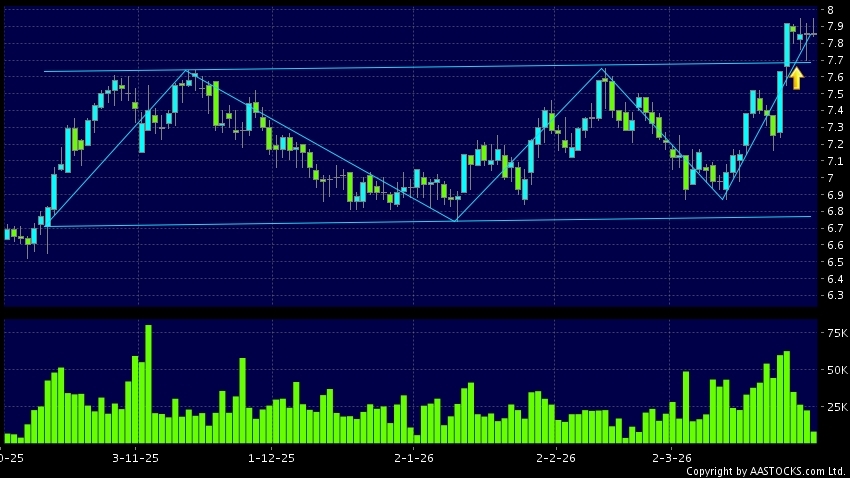 区域突破指股价在过去的一段时间只在一个范围在内活动,然後股价上升作出突破,升穿区域的顶部,技术走势向好。(港股报价延迟最少十五分钟。沽空资料截至 2026-04-01 16:25。)
