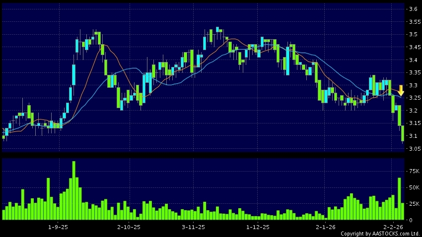 死亡交叉是一个利淡信号,指股价的短期移动平均线跌穿长期移动平均线,例如50天线跌穿250天线,在图表上构成交叉的形状。股价通常会下跌形成一个下降趋势,技术走势偏软。(港股报价延迟最少十五分钟。沽空资料截至 2026-02-06 16:25。)