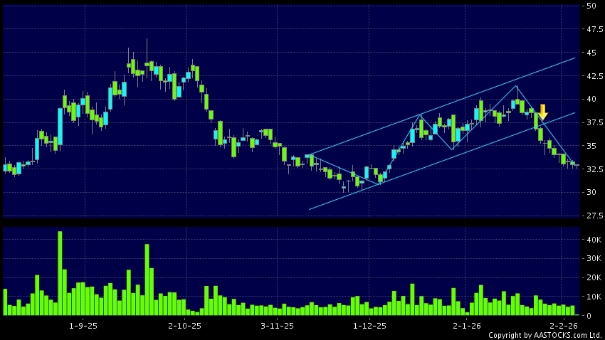 区域突破指股价在过去的一段时间只在一个范围在内活动,然後股价下跌作出突破,跌穿区域的底部,技术走势偏软。(港股报价延迟最少十五分钟。沽空资料截至 2026-02-04 16:25。)