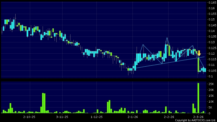 眾安集團(00672.HK) +0.003 (+3.409%) 呈現頭肩頂向下突破。現價報0.107,下跌0.926%,成交量26.30萬股,成交額2.79萬。