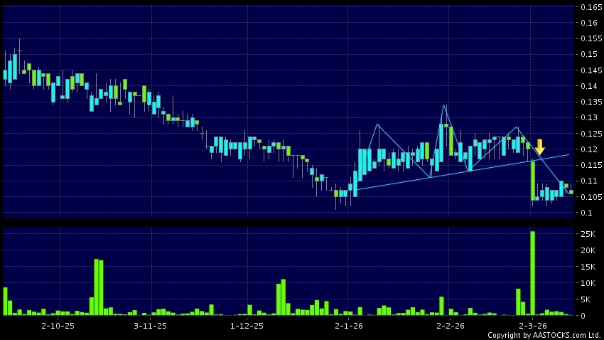 眾安集團(00672.HK) +0.003 (+3.409%) 呈現頭肩頂向下突破。現價報0.106,下跌1.852%,成交量14.14萬股,成交額1.51萬。